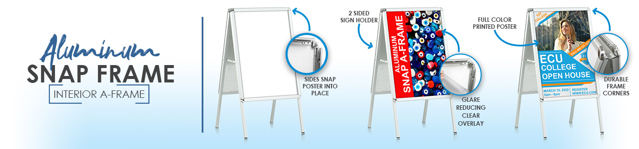 The metal snap a frame is a stylish interior a-frame. The frame snaps the printed poster into place and has a antiglare clear lens that protects the print. Weighing only 15lbs this frame is easy to set up and take down. The hinges lock into place so no worries the stand will no collapse. The metal snap a frame holds two signs, one on each side.