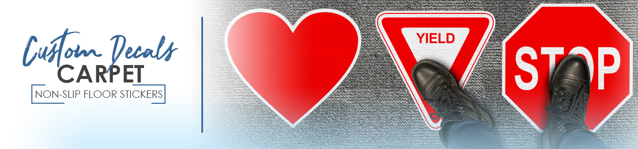 Carpet Decals use a more aggressive adhesive in order to stick to the fibers of the carpet. They will only work on tight low pile carpets like commercial carpeting, and are only for short term use. These can also be used on hard surface floors but will not remove as easily.