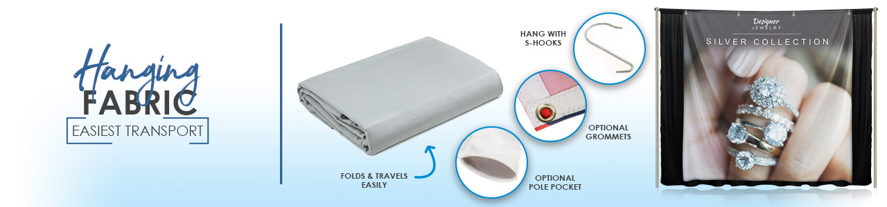 Hanging Fabric Backdrops are the least expensive way of creating a trade show backdrop. If you are allowed to hang signs off the existing frames at your trade show you simply need some large "S " hooks to attach your display to the pipes. Custom printed from your file these backdrops fold up very small and travel in your carry on if needed. Use them instead of banners to give you a more modern, sleek, and inviting look. Hang them anywhere you can attach them, they are waterproof and with the dye sublimated print, will last a long time.