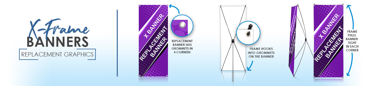 Replacing graphics for the X banner stand displays is a low-cost way for a fresh, new look on your existing X banner frame. The X banner frame is an inexpensive frame to the banner stand category for infrequent use. Price includes a full color printed banner on 12oz low curl vinyl.
