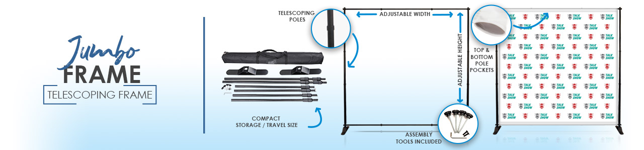 Economical Telescoping Jumbo Frame Walls create a soft look. They are transported easily. The set up time is about 15 minutes with 2 people. Step and Repeat Media Backgrounds with a telescopic "Jumbo Frame" are the hardest to set up of all our media backgrounds, but also tend to be the less expensive ones.
