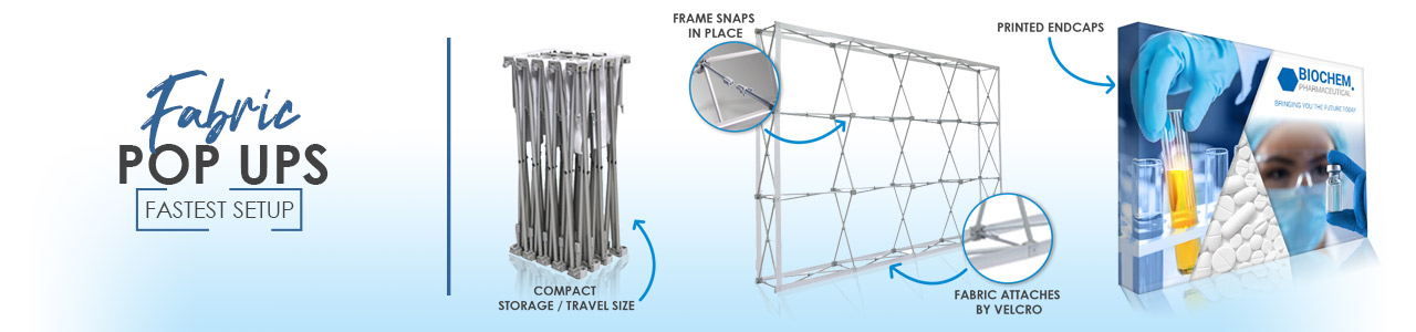 Fastest Setup of all the fabric displays. Fabric can remain attached to the frame for easy set up in less than 5 minutes. Easily change out graphics on these pop up fabric displays in minutes. Great free standing backdrop for events and trade shows.