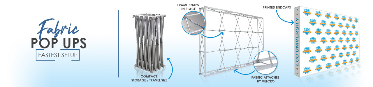 Fastest Setup of all the fabric displays. Fabric can remain attached to the frame for easy set up in less than 5 minutes. Easily change out graphics on these pop up fabric displays in minutes. Great free standing backdrop for Media events and press conferences.