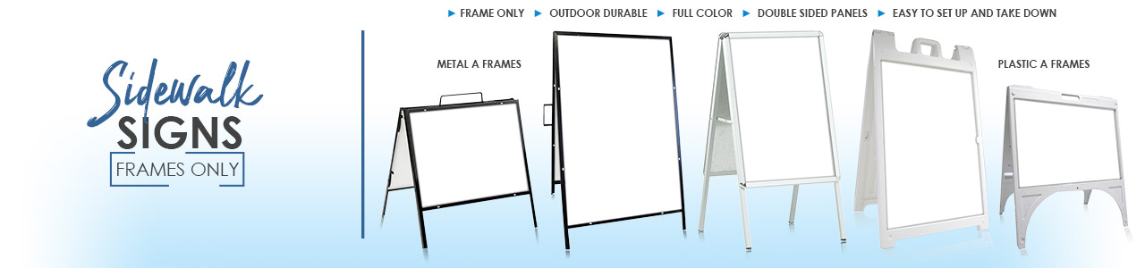 Choose from Plastic or metal A frames as well as spring type wind signs. Sidewalk signs generally mean you are trying to attract a potential customer that is walking down the street. These signs look good from close up and are not too big to take up a lot of room on a sidewalk.
