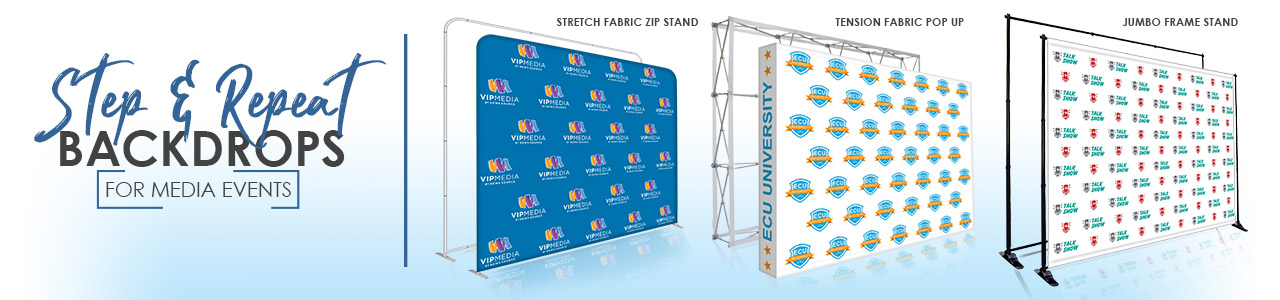Event media backdrop for press conferences, weddings, and events. Step and Repeats can use one or multiple logos or words that can be repeated to show up in the background of your video or photo providing some great brand awareness. Send us your logos and we will set the file for you and send you a proof for approval. Step and Repeats come in vinyl and fabric.