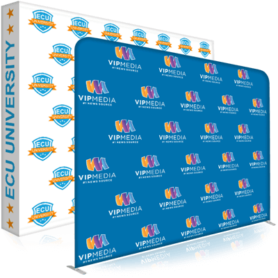 These backdrop banners, and frames, come in various sizes from 5' wide to 20' wide and from 8' high to 10' high. Many different frame types to choose from depending on your event. Our stretch fabric tube frame backdrops make excellent logo walls since the fabric is stretched over the frame eliminating any wrinkles. Sets up in minutes and is very portable.
