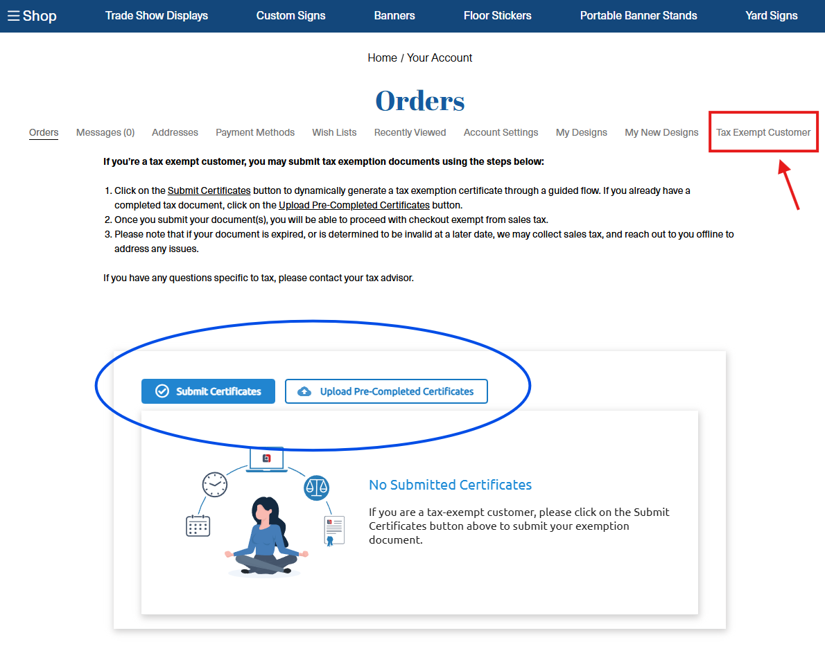 2. Upload your Tax Certificate (located in "My Account" and under "Tax Exempt Customer"