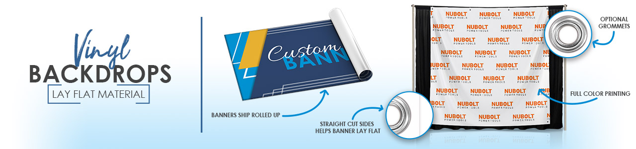Custom Vinyl Backdrops are made with a multi layer vinyl materials these banners tend to lay flatter than standard 13oz banners. Without hems these banners are similar to paper posters but much more durable. The Super Smooth PET lays the flattest and images the better of these 2, but both are very good.