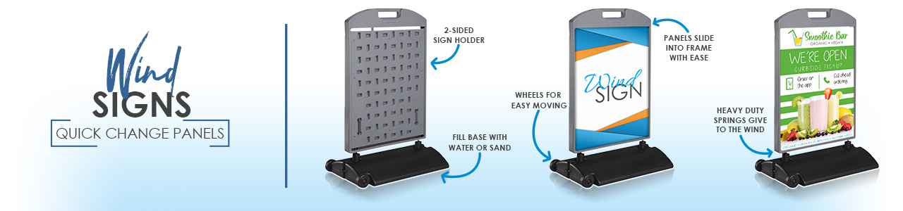 Let the wind gently wave these signs to your potential customers as they drive by. We offer a couple different types to choose from that allow the wind to spill out so they are less likely to blow over. Bases can be weighted with sand to hold up to wind. Wheels allow you to bring the Wind Signs in easily.