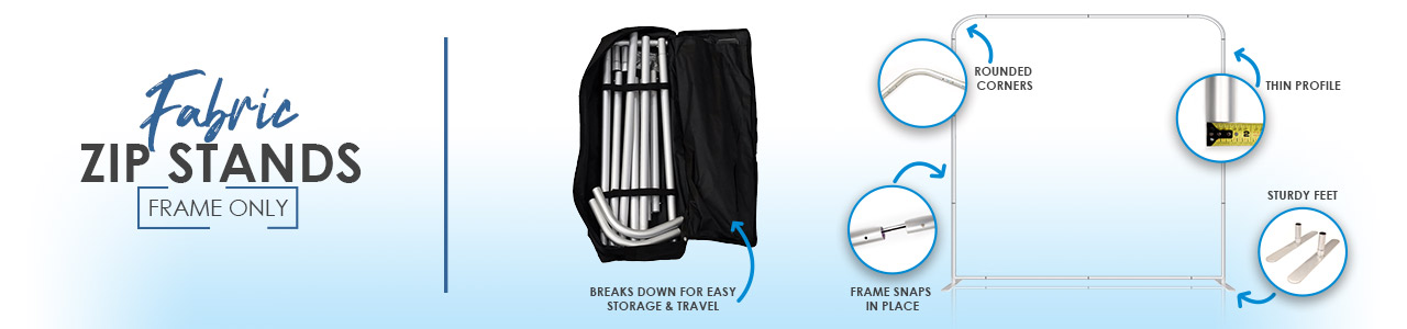 Fabric Zip Stand Only is an aluminum frame that breaks down into smaller poles for easy travel and storage. Round frame tubes are 1 1/4" in dia. Soft carrying case is included.